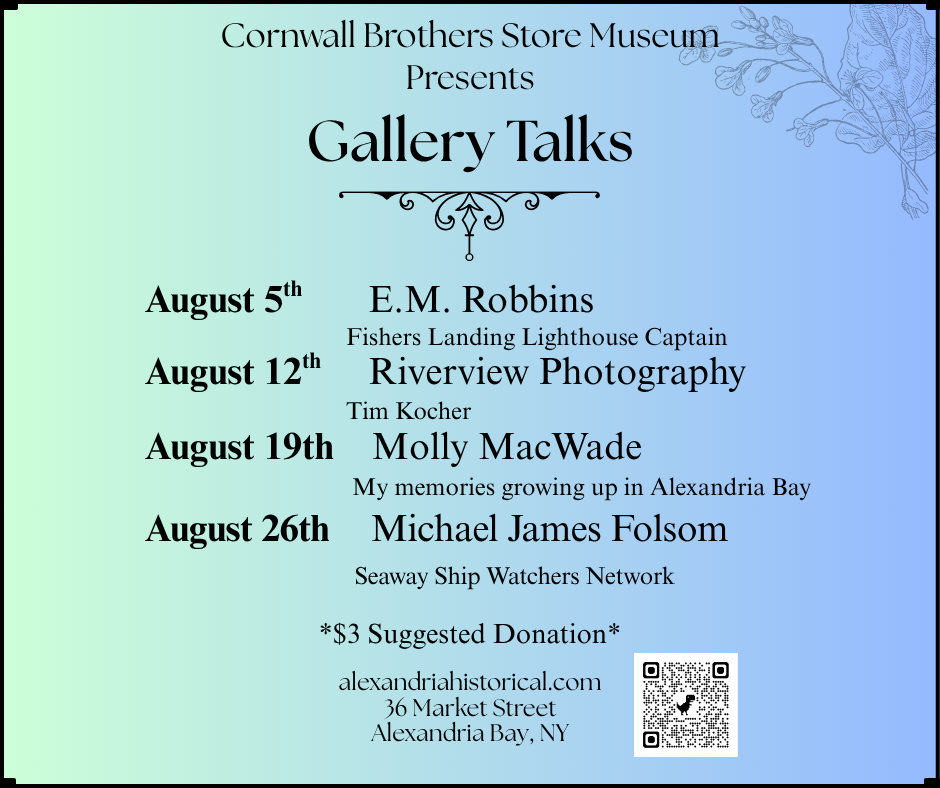 Join us at the historic Cornwall Brothers Store for presentations relating to local and regional history. All presentations are held on the first floor of the Museum at 7:00 pm, Tuesdays in August. Admission is free for ATHS members and $3.00 for non-members.